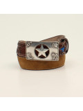 3D boys belt by M&F Western Products has a brown strap with light up blue stars inlayed on the tabs. Square buckle with western motifs. Available sizes 20-30.
