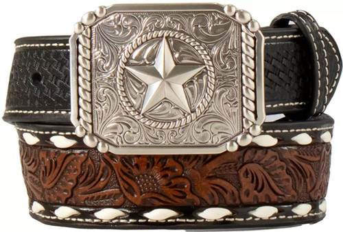 3D boys' belt by M&F Western Products is genuine black leather with basket weave embossed billets. Floral embossed body with twisted white buck lace stitching. Rectangle buckle with a raised engraved star and an engraved scrolling background.