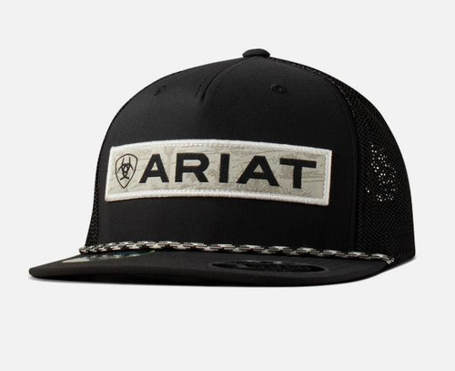 Ariat men's cap by M&F Western Products. Black fabric on the front panel and bill with a black and white brim rope. Black mesh back with a fabric snap back closure for that perfect fit.