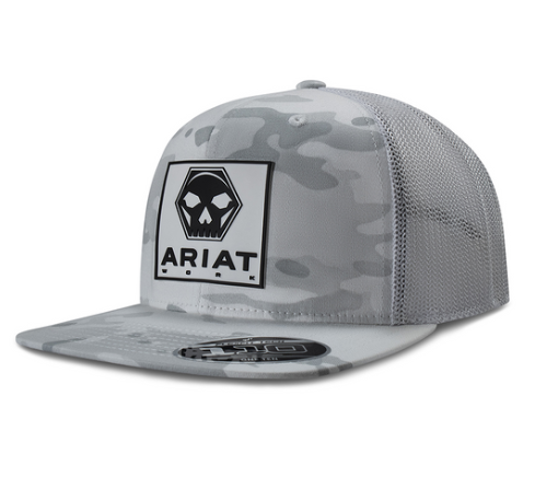 Ariat Work men's cap by M&F Western Products. White/grey camo on the front and the bill, and a black and white skull bolt rubber patch on the front. White mesh back. Snap back closure for that perfect fit.