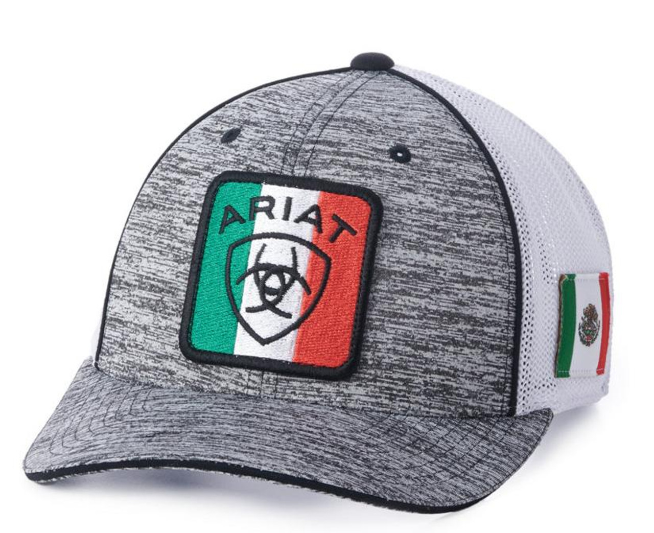 Ariat heather grey cap with the Ariat patch in Mexican Flag colors on the front. White mesh back with a snapback closure and small Mexican flag on the right side near brim.