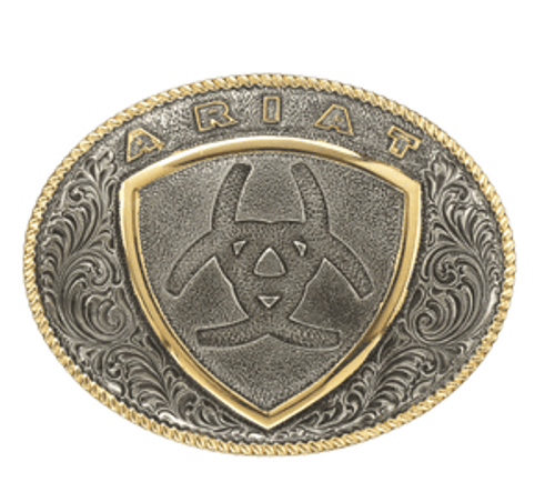 Flashy Ariat buckle by M&F Western Products. It has an antique silver and antique gold finish. Ariat shield logo across front of the buckle.