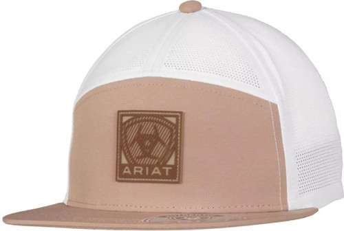 Ariat® men's cap by M&F Western Products. Flat bill with a tan front panel and white mesh. Tan PVC square Ariat patch in the center. Snap back closure for that perfect fit.