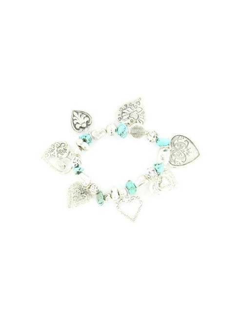 This Blazin Roxx bracelet by M & F Western Products is a turquoise rock and silver stretch bracelet which provides a perfect fit. Heart charms accent this attractive bracelet.