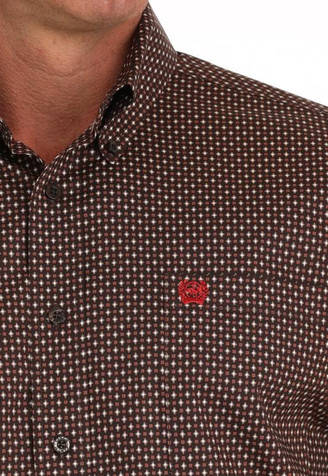 Crafted to style your way every day, this caramel-brown cotton plain weave with allover diamond print is ranch or office ready! The perfect choice for pairing with blue jeans, this shirt features an open left front pocket with embroidered logo and pearlized buttons.