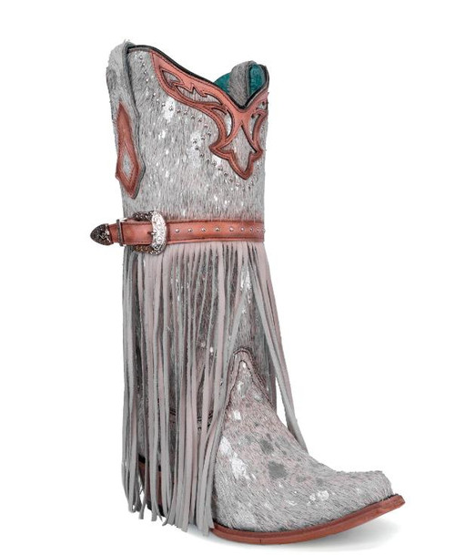 SALE Corral Boots® Ladies' White Acid Wash Fur Harness with Studs & Lamb Fringes Snip Toe Boots