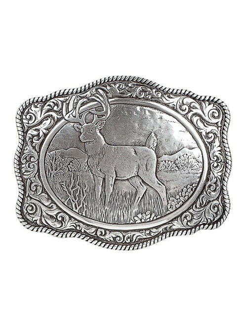 Kickin' it rodeo, nature's way! This rectangle Crumrine belt buckle features a unique buck in the meadow design in silver with roped edges.
