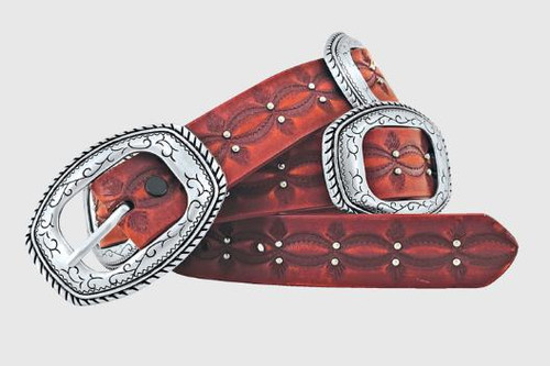 Distressed leather belt with cut non-stitched edges, embossed designs down strap with hand sanded effect, accent silver finish studs and buckle/conchos in silver finish.