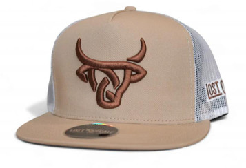 Baseball cap with Lost Calf logo embroidered on front in brown, Lost Calf stitched on left side. Snapback - one size fits most.