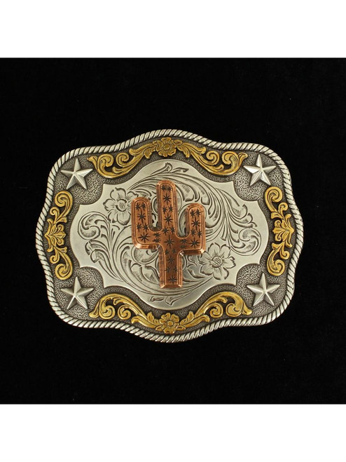 This rectangle Nocona mens western buckle by M&F Western Products is antique silver with a gold flower and silver star background. Large copper cactus in center of buckle. Color: Copper/Gold/Antique Silver