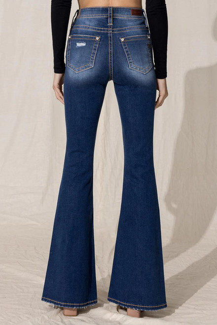 High rise, dark wash flare jeans detailed with destruction and contrast stitching. Back pocket design features border stitching, slight distress, and embroidered M logo. Rhinestone rivets included. Miss Me patch featured.
