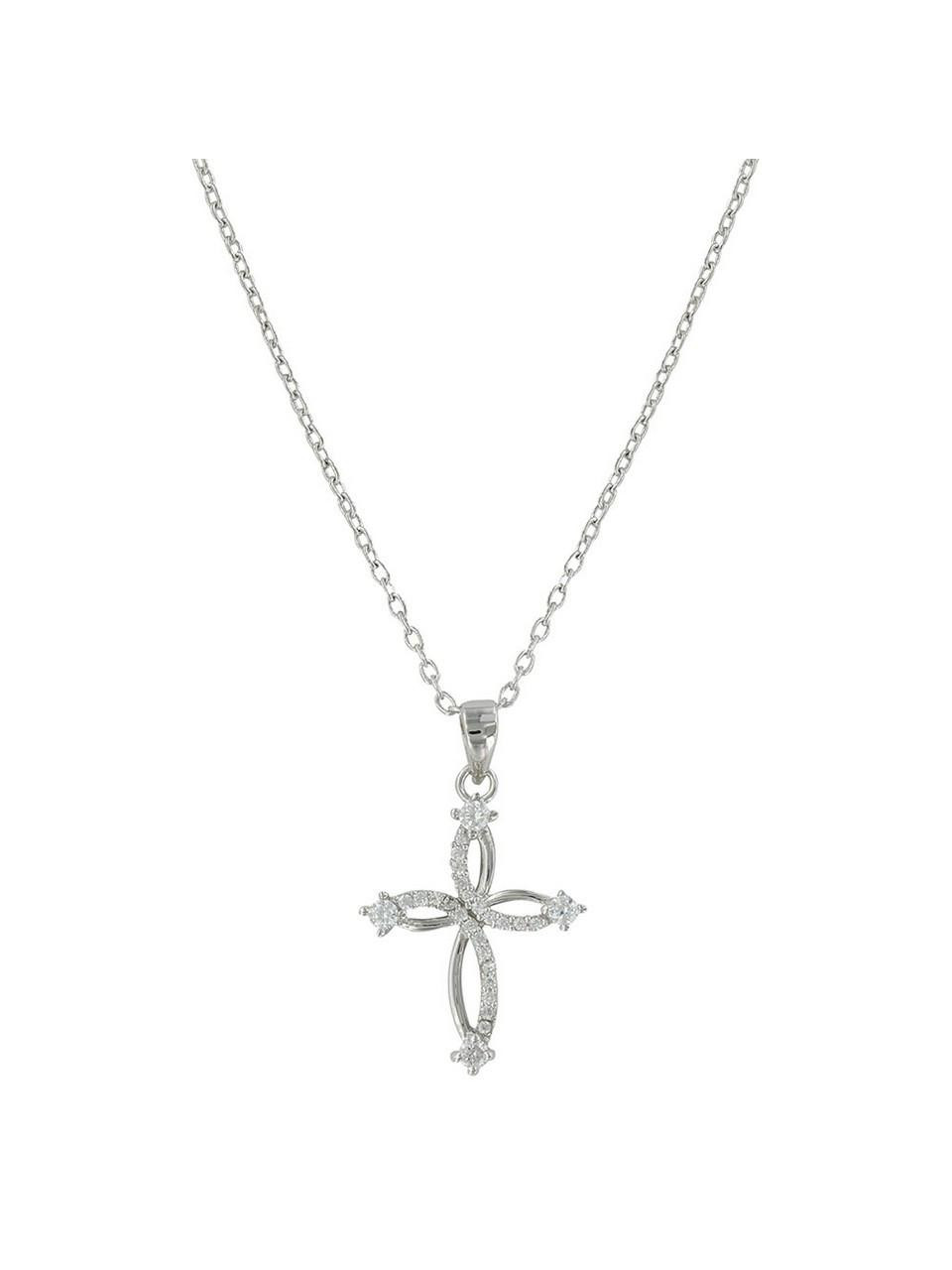 Looping lines of smooth silver tone run opposite of lines set with small clear stones to form an open arm cross pendant. Each arm of the cross is accented by a clear square stone set at the tip. Necklace pendant hangs on a princess length 19 inch cross.