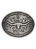 This large antiqued silver tone oval antiqued Classic Impressions Attitude belt buckle features a longhorn figure in the center surrounded by traditional western filigree, edged with barbed wire and twisted rope trim. Classic western filigree markings decorate the back for added detail. Standard 1.5" belt swivel.