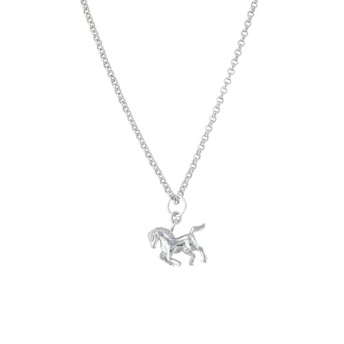 This delightful prancing horse charm necklace is sure to please everyone from the littlest horse lover to the biggest. The bright silver tone of the horse has delicate details that seek to capture that wonderful feeling when you see a horse running free across a field. Necklace charm hangs from a matinee length 21 inch chain.