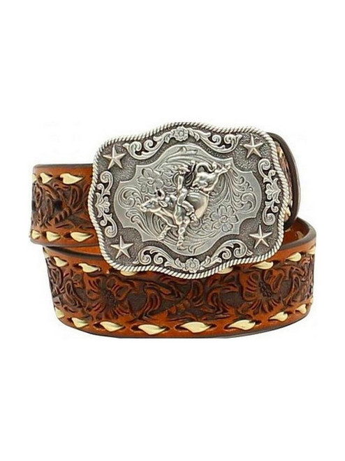 He can dress like the real deal with a handsome cowboy buckle belt by Nocona. This boys' western belt is made of genuine leather with a floral scrolling design throughout. A silver-tone rectangle buckle boasts scalloped and roped edges, scrolling accents, and a rodeo bull rider motif. The belt has bold leather lacing on the edges, and measures 1 1/4" wide.