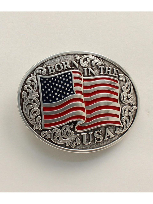 This oval Nocona mens western buckle by M&F Western Products features a USA flag and western scrolling along with the words “Born in the USA”.
