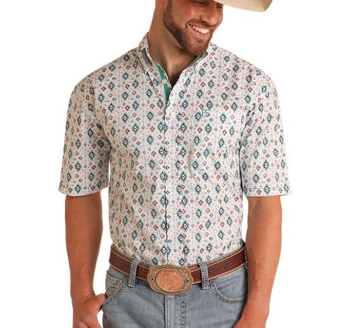 Panhandle Rough Stock® Men's S/S White/Turquoise/Brown Aztec Print Button Shirt
