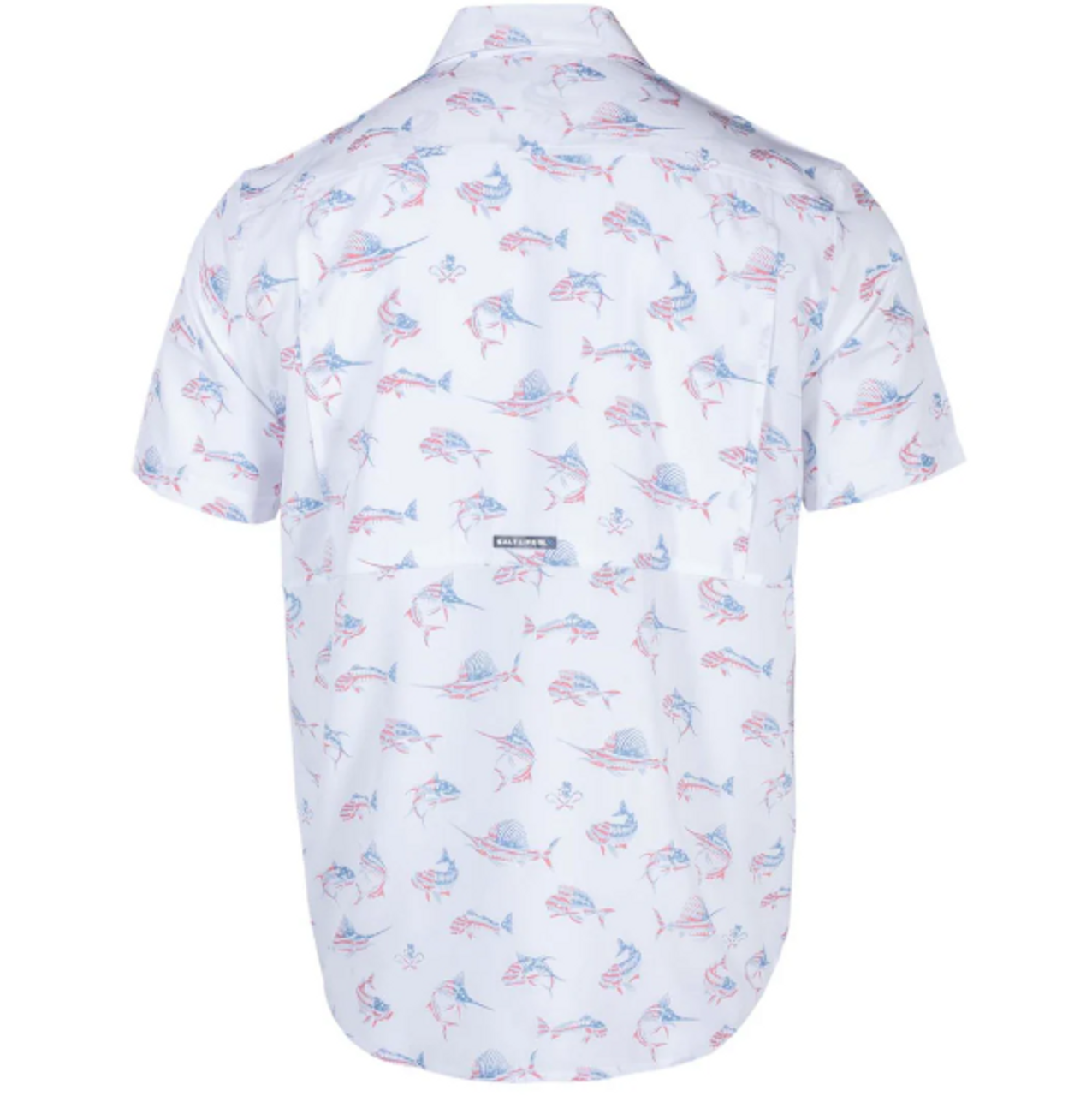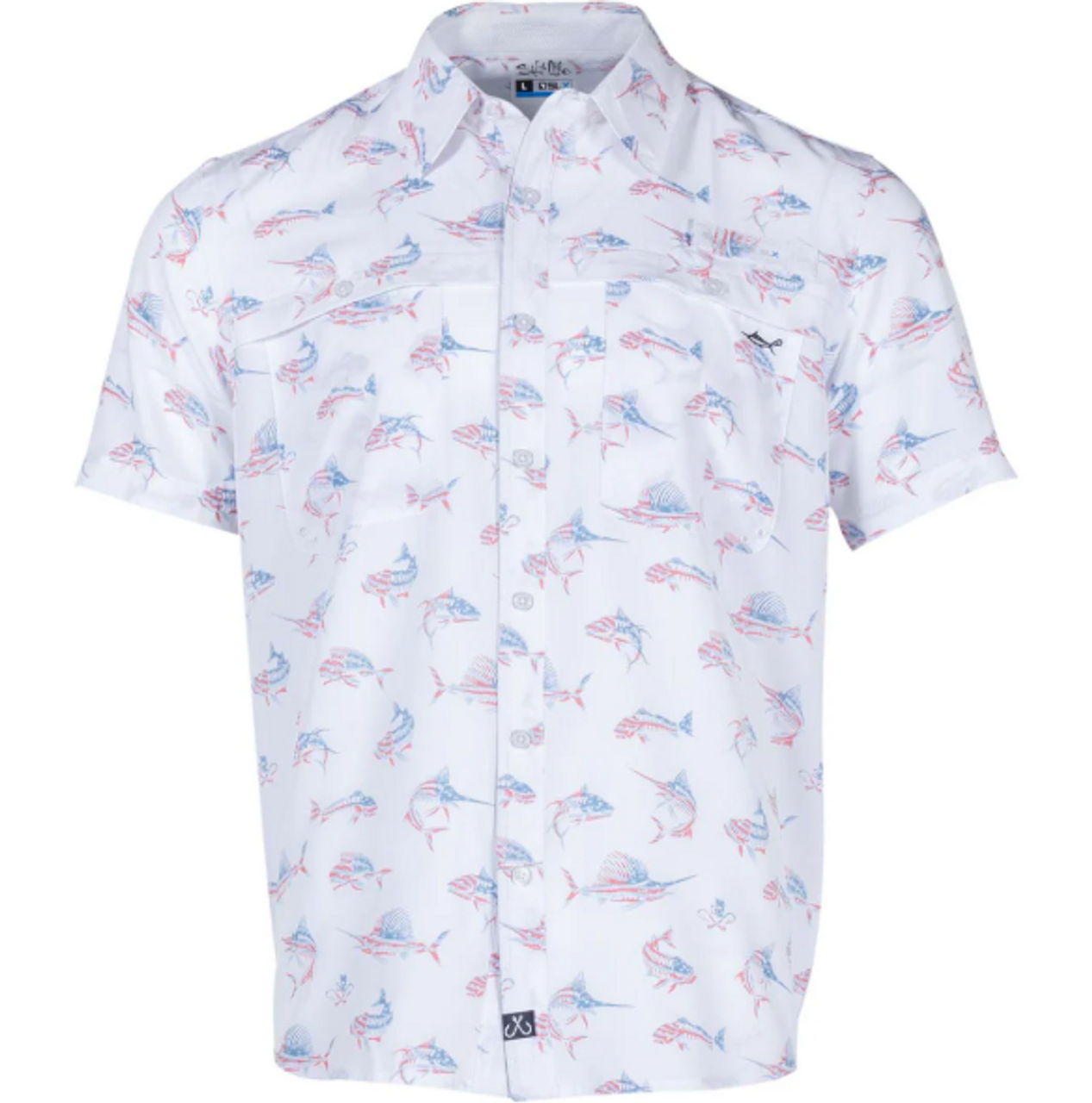 The Fish N' Bones Americana Performance Shirt is the perfect performance fishing shirt. Its classic fit is complemented by functional features like 2-button front pockets with yoke flap, velcro rod holder, and vented back with mesh for breathability. With moisture wicking, antimicrobial material, and UPF 30 protection, this shirt has everything you need to make your next fishing trip a success.