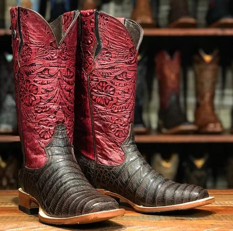 Tanner Mark® Ladies Caiman Belly Printed Brown With Raspberry Hand Tooled Printed Top