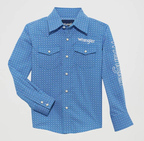 This long sleeve shirt features Western snaps and yokes and two flap snap pockets. Logo embroidery appears across the back yoke and down the sleeves.