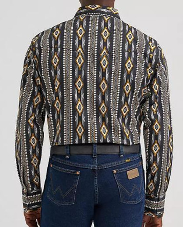Wrangler's Checotah® has a home in the closets of cowboys around the world. This men's Checotah long-sleeve western snap Navajo-inspired printed shirt is designed to make a statement no matter the destination. It features a classic fit, a spread collar, pointed yokes, two snap flap pockets with a convenient pencil slot, adjustable cuffs, and a full-length snap closure for the finishing touch. Best of all, it's crafted from cotton for uncompromising comfort. Look sharp at a moment's notice by wearing your Checotah shirt with a Wrangler Retro® or Cowboy Cut® jean.